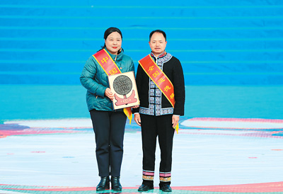 全国道德模范、云南省文山壮族苗族自治州广南县莲城镇北宁中心学校落松地小学教师农加贵(右)为“中国好人”徐建红赠送“道德传家宝”。邓纯雪 摄