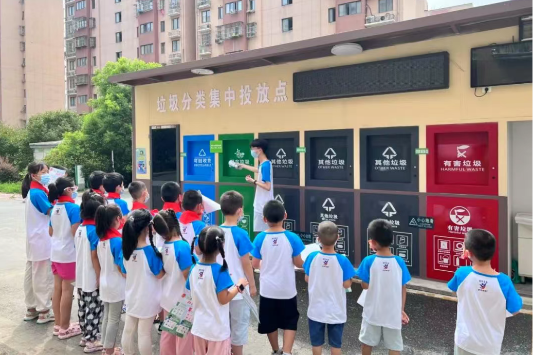 暑期托管班的志愿者教师宣讲垃圾分类知识。